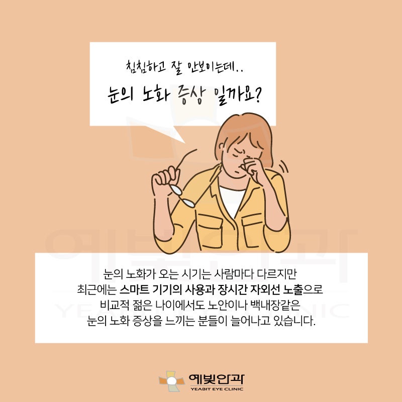 노안 연령이 점진적으로 감소하는 원인을 과도한 전자기기 사용, 스마트폰 사용을 포함한 컴퓨터의 과도한 사용, 눈의 피로도 가중, 무기력 등이 원인이라고 생각하여