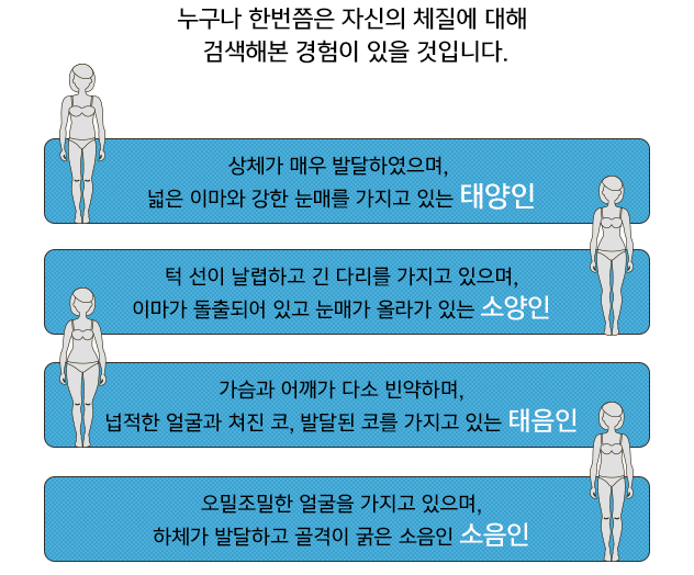 사상체질은 나의 동지 이제마 교수가 연구한 연구이다. 같은 질병을 앓았는데 같은 약을 써도 낫지 않는 사람이 있었나요? 사람의 체질에 맞게 약을 사용해야 하듯이, 사람의 체질과 성향을 알고 대화를 나누면 가려운 부위를 알 수 있습니다. 좋은 대화 방법을 사용하면 의사소통이 훨씬 좋아지겠죠? https://mblogthumb-phinf.pstatic.net/MjAxODAzMjBfNDMg/MDAxNTIxNTQ0ODEwNTk4.pWXeslzthBPJrTBrsPHiIoxkDIw2jc8XvMxrDcsIgCYg.Xlux_S3qh1q8PzmsL5Lc3qxWgPipuF4wx5cSKucrvSIg.PNG. 리아히로/%EC%82%AC%EC%83%81%EC%B2%B4%EC%A7%88%EA %B0%95%EC%9D%98_%EA%B2%BD%EB%82%A8%EA%B5%90%ED%86%B5%EB%AC%B8%ED%99%94%EC%97 %B0%EC%88%98%EC%9B%90_%EA%B2%BD%EB%82%A8%EA%B3%B5%EB%AC%B4%EC%9B%90%EB%8C%80 %EC%83%81_%EA%B9%80%EC%9A%A9%EA%B7%A0%EA%B0%95%EC%82%AC3.png?type=w800