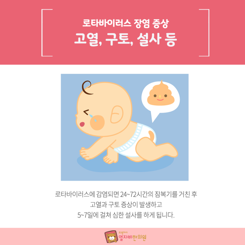 1. 정의 : 로타바이러스(Rotavirus)에 의해 발생하는 감염병으로 레오바이러스과에 속하며 장염을 일으키는 바이러스이다. 전 세계적으로 발생하는 급성 위장염의 가장 흔한 감염원은 로타바이러스로 감염성 설사의 70~80%를 차지한다. 로타바이러스는 어린 소아의 심각한 위장염의 가장 중요한 원인이며 매년 55,000~70,000건의 입원을 유발합니다. 전 세계적으로 매년 5세 이하 어린이 1억2500만명이 감염되고 있으며, 위생상태가 좋은 미국에서도 매년 100만명 이상의 어린이가 로타바이러스로 인한 심한 설사병에 걸리고 있다. 설사로 인한 탈수 증상이 심할 경우 사망에 이를 수도 있다. 우리나라에서는 찬 바람이 불기 시작하면 증가하고, 대기가 건조한 이른 봄까지 가장 많이 발생한다. 80% 이상의 사례가 6~24개월 사이에 발생하며, 9~12개월 영아가 가장 취약합니다. 2. 감염경로 1) 분변-구강 -> 주로 산후조리원, 신생아실, 유아시설, 병원 등 사람이 많이 모이는 장소에서 오염된 식수나 음식물 섭취, 어린이가 가지고 노는 장난감 등을 통해 감염됩니다. 오염된 표면과의 접촉을 통해서도 감염될 수 있습니다.2) 잠복기: 1~2일3) 바이러스의 존재: 임상 증상이 나타나기 전부터 증상이 사라진 후 10일까지 감염자의 대변에 존재합니다. 따라서 증상이 없더라도 쉽게 전파될 가능성이 높다. 평균적으로 설사 증상이 나타나기 1~2일 전부터 최대 12일까지 바이러스가 쉽게 전파될 수 있으며, 설사 증상이 나타난 후 3~4일이 전파 위험이 가장 높은 시기입니다. 4) 출산 중 감염될 수 있습니다. 3. 증상 1) 발열 -> 대개 감기 증상으로 시작되기 때문에 감기와 혼동하여 심해지는 경우가 많다. 심한 경우에는 열성경련(5%)을 동반하기도 합니다.2) 구토3) 설사 -> 보채기 및 수유실패 후 묽은 설사가 나타납니다. 설사의 모양은 녹색, 노란색 또는 쌀물처럼 묽은색입니다. 양이 많고 빈도도 하루 2~3회에서 10회 이상까지 다양하며 평균 7~10회 정도이다. ① 가벼운 설사 – 설사 5회 미만 – 탈수 증상 없음(피부가 부드러워지고 피부 탄력이 정상임) – 미열 또는 정상 체온 – 정상 소변량 ② 중등도 설사 – 설사 5~10회 미만 – 경미한 탈수 증상 – 미열 또는 정상 체온 ③ 심한 설사 – 하루 최대 10회 – 중등도 탈수 – 약함 빠른 맥박과 호흡 – 창백하고 차가운 피부 – 불안과 무기력4) 무증상 감염5) 무호흡성 서맥6) 드물게 괴사성 장염과 연관됩니다. 4. 진단용 대변검사를 통해 바이러스 또는 바이러스 항원 검출 5. 치료 1) 수액요법 -> 로타바이러스는 탈수로 인해 심각한 증상을 유발할 수 있으므로 탈수 예방이 가장 중요하다. 2) 모유수유를 하면 증상이 완화됩니다. 그것은 할 수 있습니다. -> 모유에 함유된 당단백질인 Ig A -> 다양한 연구를 통해 로타바이러스 장염에 대한 다양한 보호 효과가 관찰되었습니다. 3) 수유 시에는 다음 사항을 주의 깊게 살펴보아야 한다. ① 우선 아이의 전반적인 건강 상태입니다. 상태와 탈수상태를 확인하세요. (탈수 증상으로는 점막 건조, 눈물 감소, 천문 함몰, 눈 침몰 등이 있습니다.) ② 대변의 모습을 확인합니다. -> 설사의 양과 정도를 확인하세요. 녹색인가요, 갈색인가요? 혈액에 혈액이 섞여 있는지 확인하고, 수분이 많아 점도가 물과 비슷하거나 끈끈한지 확인하고 시간을 확인합니다. ③ 기타 -> 섭취량 및 배설량, 체중의 증가 또는 감소, 갈증, 피부결 및 탄력, 아이의 활동량 등 6. 예방법 1) 손 씻기가 가장 중요합니다. 따라서 외출 후에는 어린이는 물론 어른들도 흐르는 물에 손가락 사이로 손과 발을 꼼꼼히 씻는 습관을 들여야 한다. 2) 어린 아기의 경우 장난감 등의 물건을 입에 넣어 감염이 쉽게 발생합니다. 로타바이러스는 물체 표면에서 며칠 동안 생존할 수 있으므로 아기의 장난감은 주기적으로 철저하게 청소해야 합니다. 3) 로타바이러스는 밀폐되고 밀집된 공간에서 쉽게 발생할 수 있으므로 24개월 이후 아픈 사람을 방문하거나 사람이 많이 모이는 장소에 갈 때는 반드시 소독을 해야 한다. 4세 미만 영유아 동반 금지) 장염 증상이 나타나기 전에 바이러스가 방출되므로 일상생활에 주의가 필요합니다. 5) 엄마와 아이가 병실을 공유하도록 장려하면 신생아실 내 감염을 예방할 수 있습니다. 6) WHO에서는 로타바이러스 백신 접종을 권고하고 있습니다. 백신에는 5가 백신인 로타텍(Rotatec)과 1가 백신인 로타릭스(Rotarix) 두 가지 종류가 있는데, 두 가지 모두 효과가 뛰어난 것으로 알려져 있다. 로타텍은 3회(2,4,6) 접종이고, 로타릭스는 2회(2,4) 접종이다. 예방접종은 생후 6주부터 8개월 미만의 모든 아기에게 실시됩니다. 로타바이러스는 밀폐된 공간이나 사람이 많이 모이는 공간에서 쉽게 전염되므로 어린이집에 보내는 어린이는 반드시 예방접종을 받아야 합니다. 7. 예후 -> 사망은 드물지만, 탈수가 심해지면 사망에 이를 수도 있다. -> 다른 유형으로도 재감염이 가능하다.