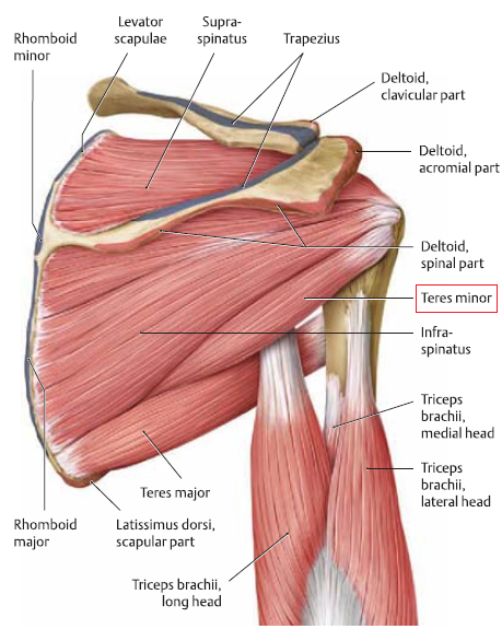 또한, 소원근과 대원근, 삼두근의 장두 사이에서 액와신경이라고 하는 신경이 포착되기 쉽기 때문에 포착에 의한 통증과 저림을 나타내기도 합니다. 소원근에 의한 액와신경 포착은 특히, 삼각근이라고 하는 위팔부분으로 국한된 통증과 저림을 나타내기도 하는데요.