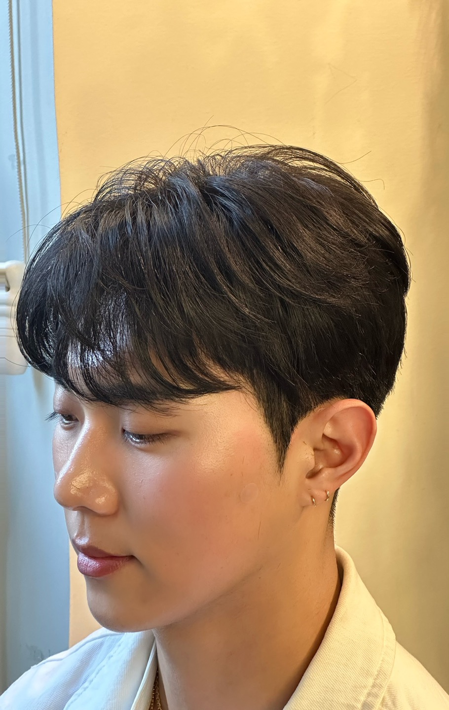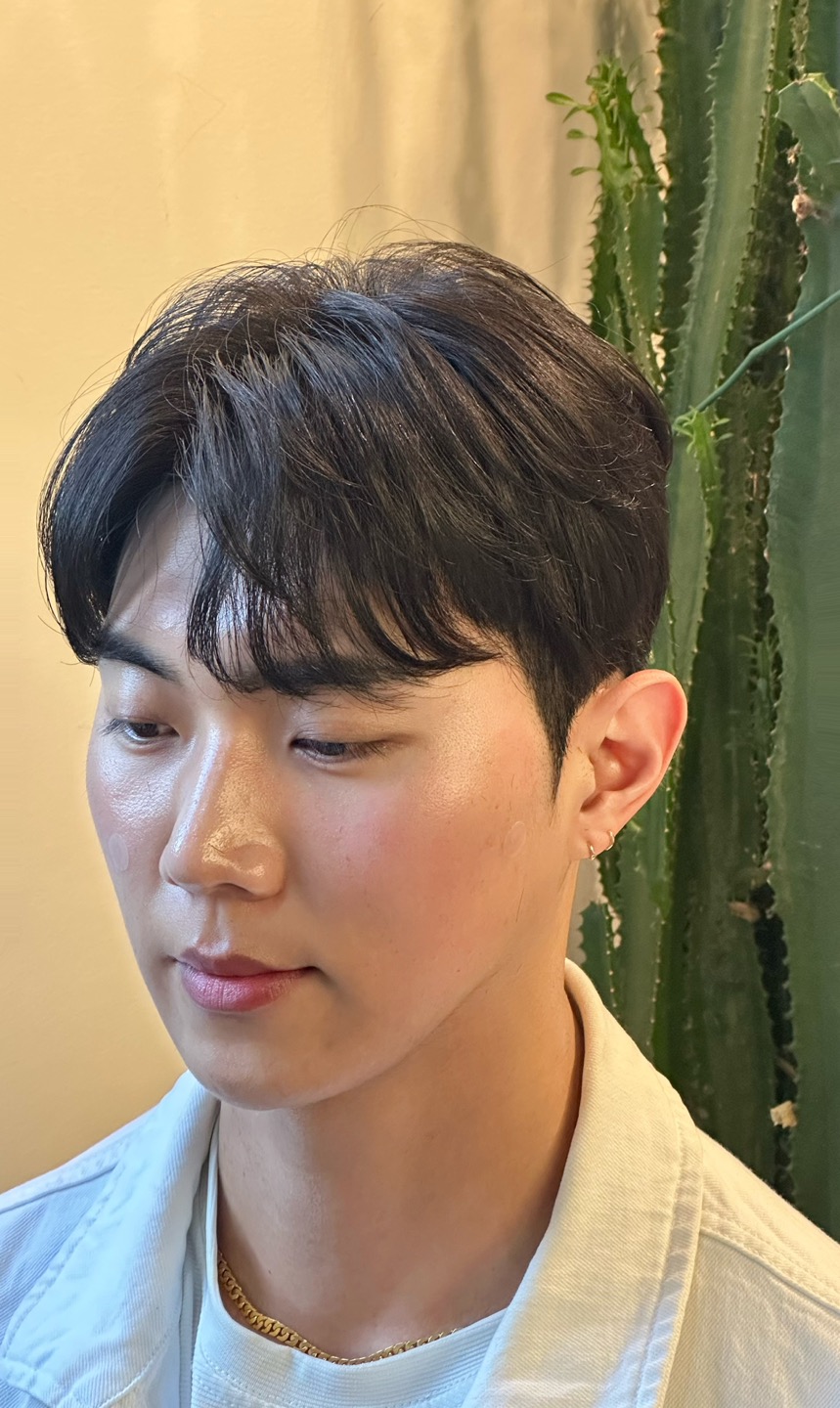 남자의 이미지는 기장에 따라 달라지는데, 앞머리를 오픈했는지 안뜨는지가 더 큰 영향을 미치는 것 같아요! 이마를 밝게 하면 남성적인 매력을 어필할 수 있다는 장점이 있습니다. 이마가 너무 넓거나 이마에 볼륨이 부족한 분들에게는 이마를 적당히 열어주는 시스루 애스펌이 딱! ㅋ.