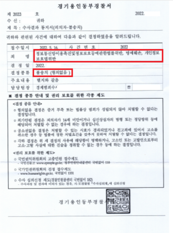 김동우 변호사는 경찰서 자문 경력이 있는 만큼 수사기단계에서 최선의 조력을 하였고, 그 결과 불송치 결과가 나왔습니다. 이에 대해 검찰에서 보완수사 등을 이유로 검찰에 송치하였는데요.A&Lab 대표변호사는 우리 의뢰인이 개인정보보호법위반에 있어서 1) 해당 영상에서 고소인 B씨의 모습이 나오지 않는 다는 점 2) 같이 송치된 피의자들 또한 개인정보 처리 담당자라는 점 3)영상에 나오는 당사자로부터 열람에 관한 대리권을 부여받았다는 점 을 변호인의견서에 구체적으로 정리하여 담당 검사에게 제출하였습니다.그 결과 대구지방검찰청 안동지원은 변호인의 주장을 인정하여, 개인정보법위반 무혐의 처분으로 사건을 종결하였습니다.